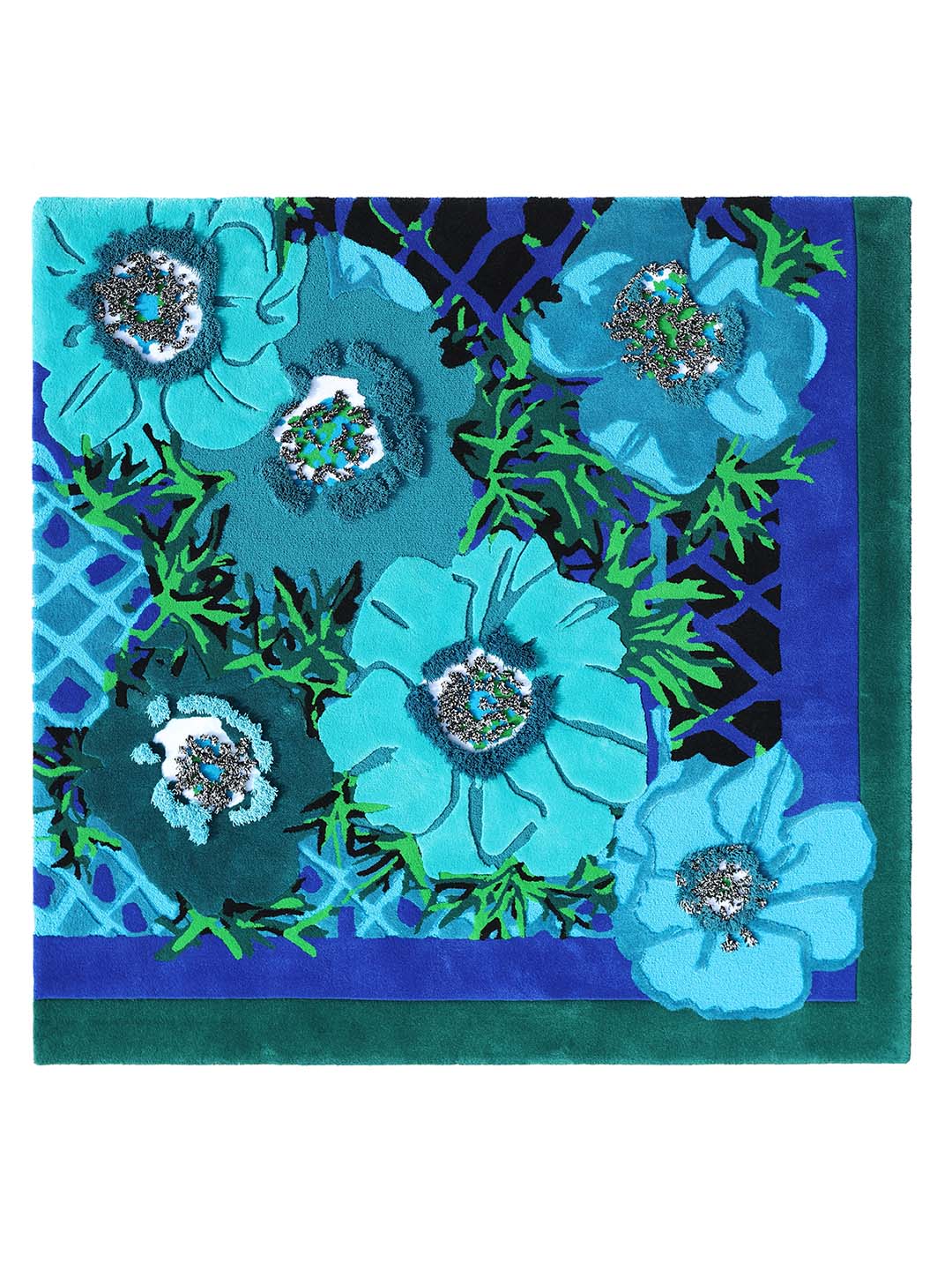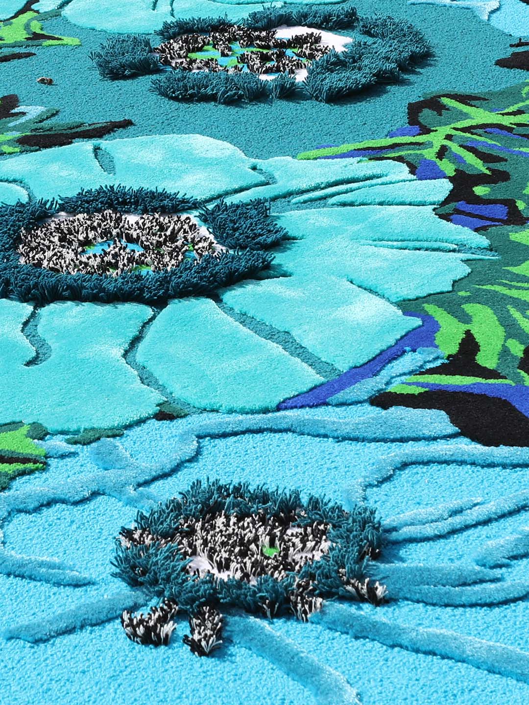 The carpets show the world of Ken Scott, made of colour, irony, spectacular flowers, animals and childish abstract shapes.