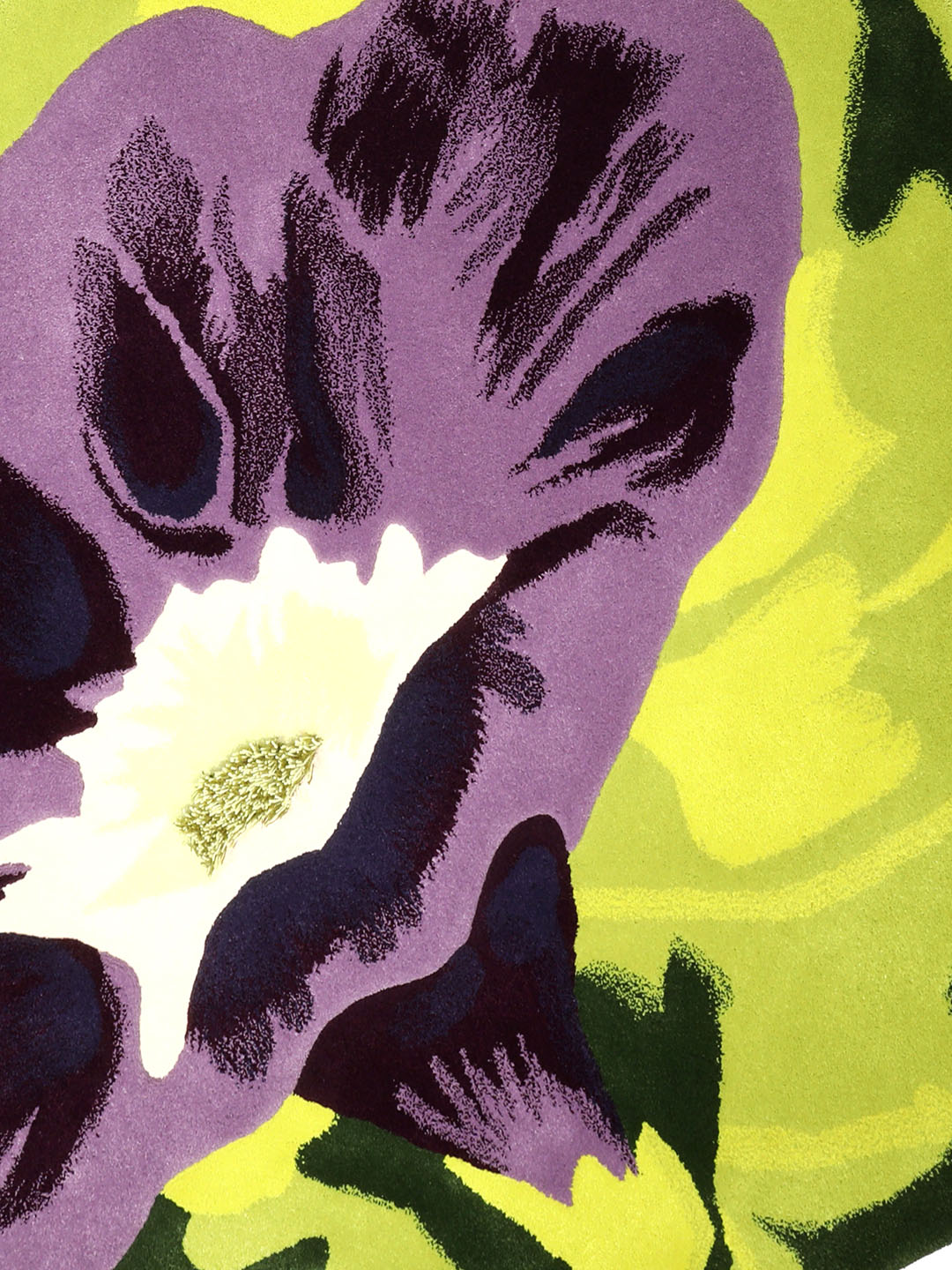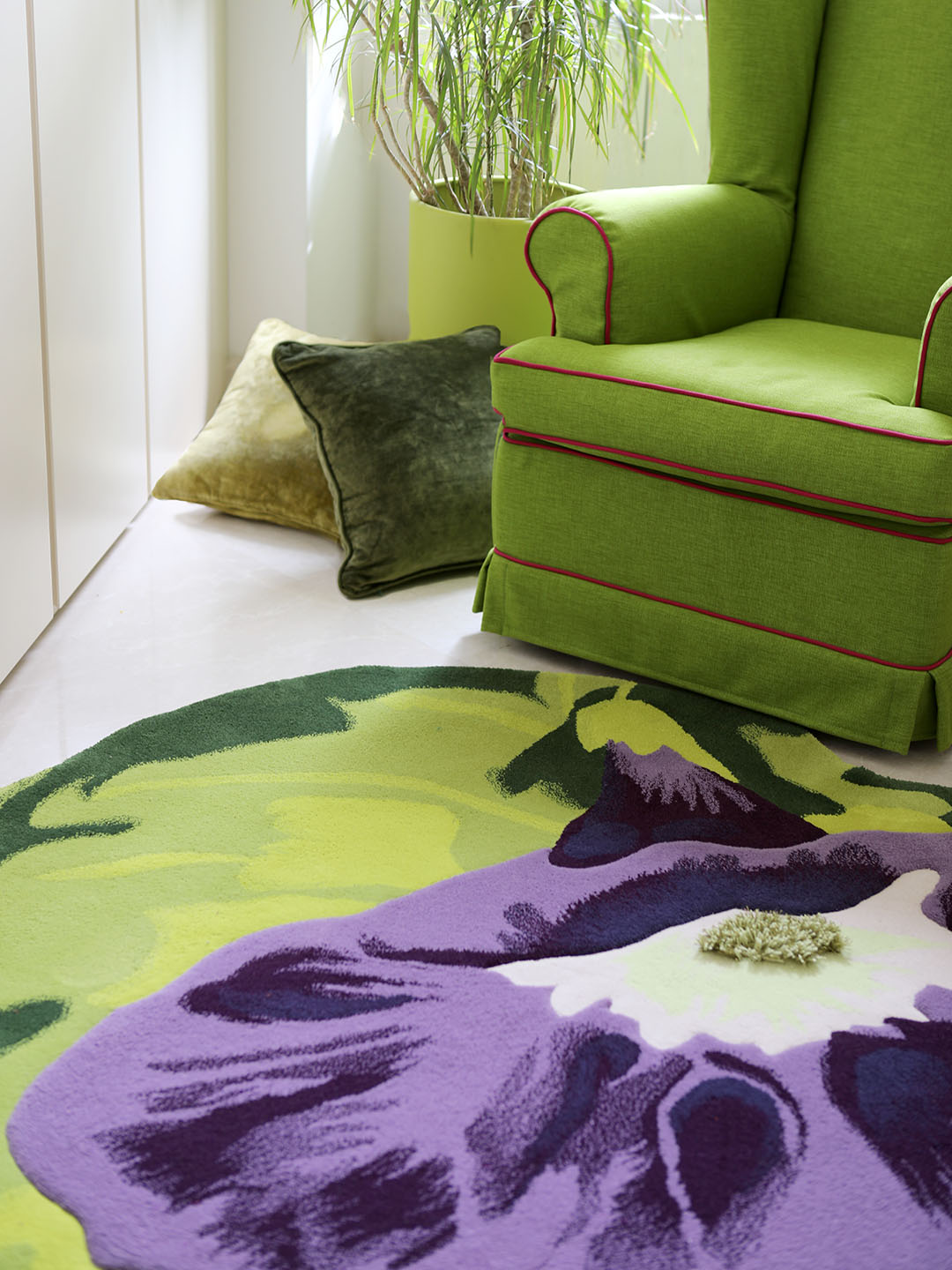 I tappeti raccontano il mondo di Ken Scott, fatto di colore, ironia, fiori spettacolari, animali e fanciullesche forme astratte.