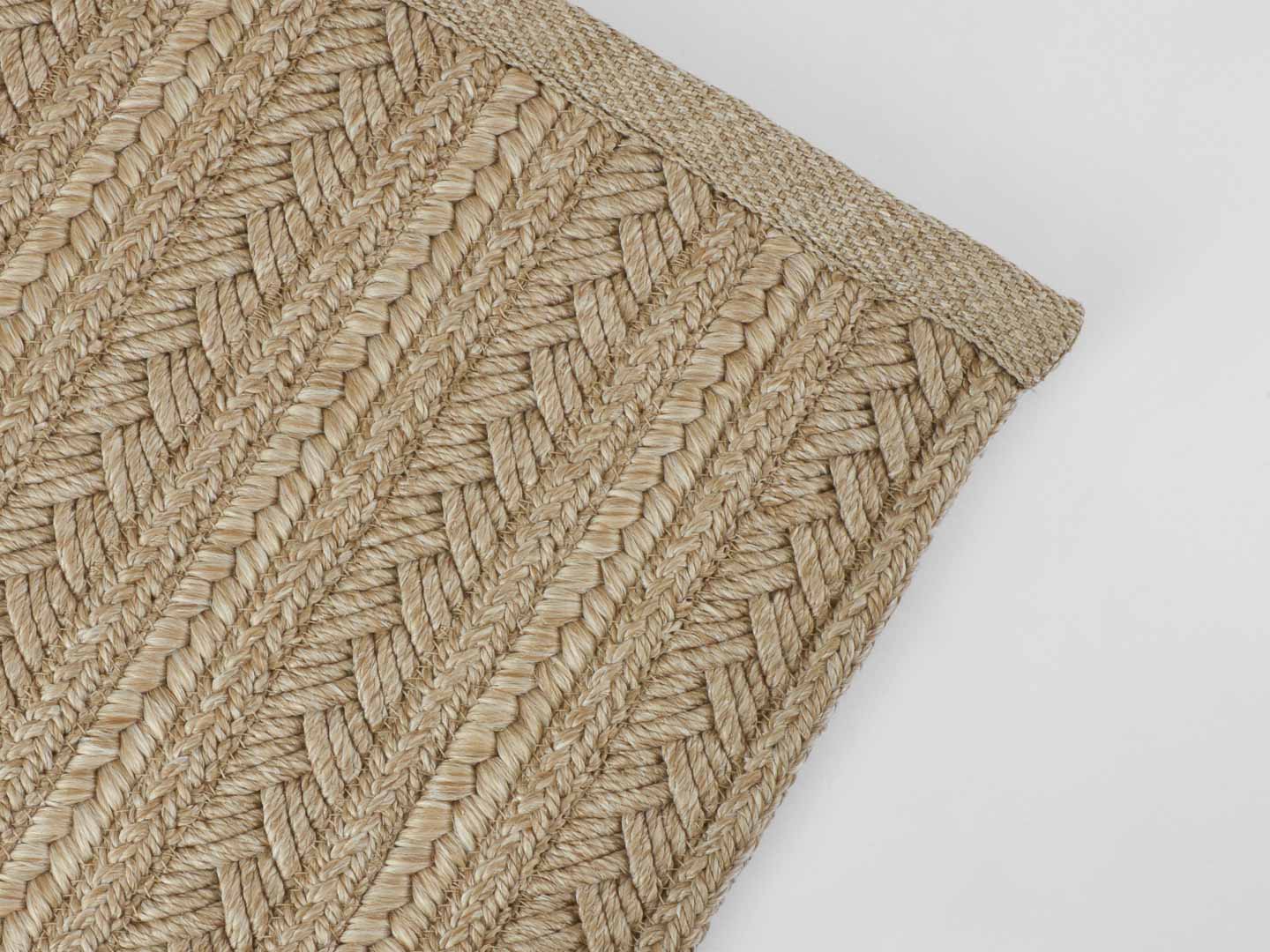 Il modello Pool presenta una trama intrecciata a trecce di diverso spessore che crea pattern unici, realizzato in 100% polipropilene per uso interno ed esterno.
