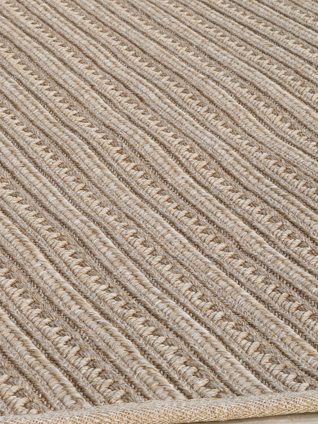 Il modello Pool presenta una trama intrecciata a trecce di diverso spessore che crea pattern unici, realizzato in 100% polipropilene per uso interno ed esterno.
