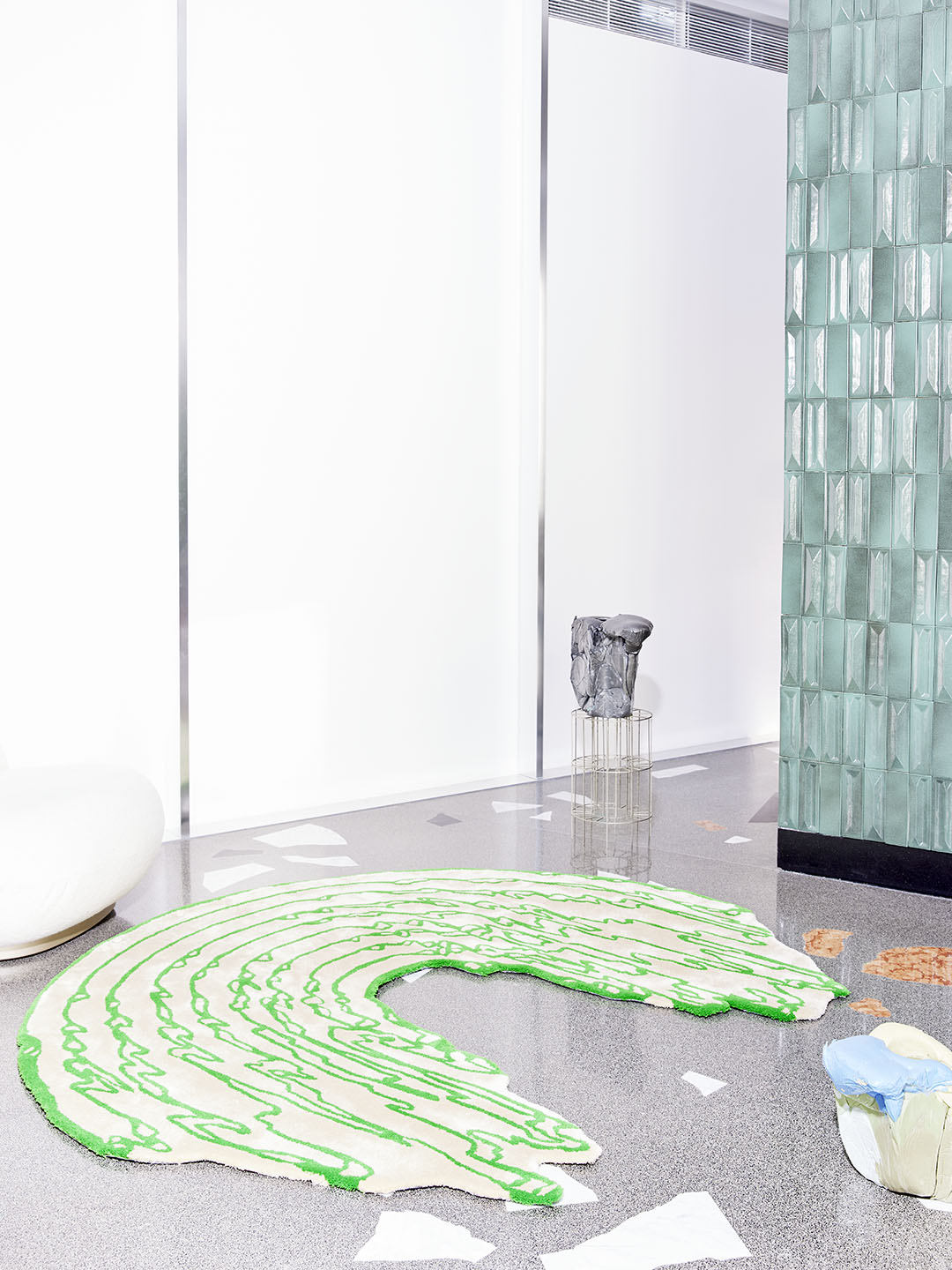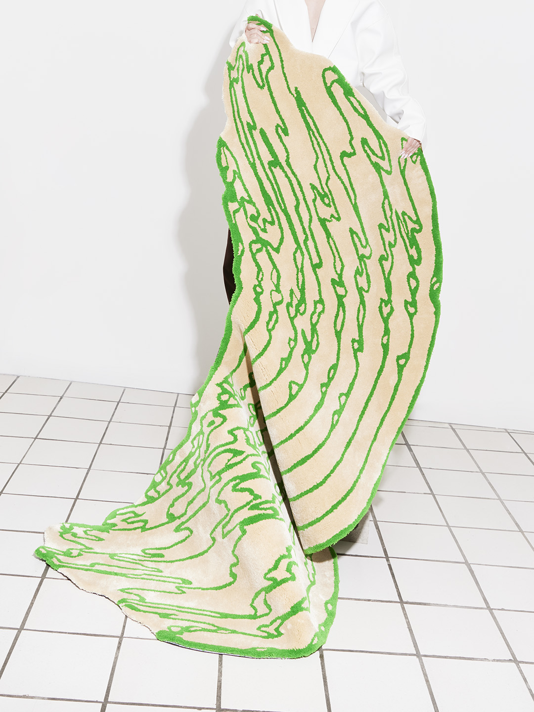 La collezione di tappeti Floor Is Lava di PLACéE è composta da sei opere che ritraggono in chiave bicromatica la deformazione superficiale che si verifica dopo un'esplosione piroclastica.Telai orizzontali o verticali.
